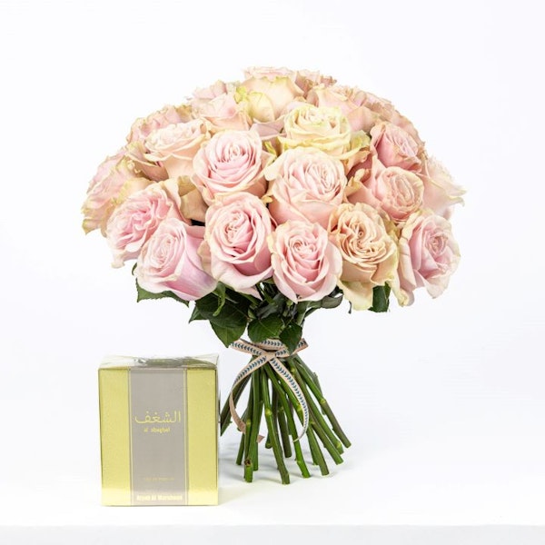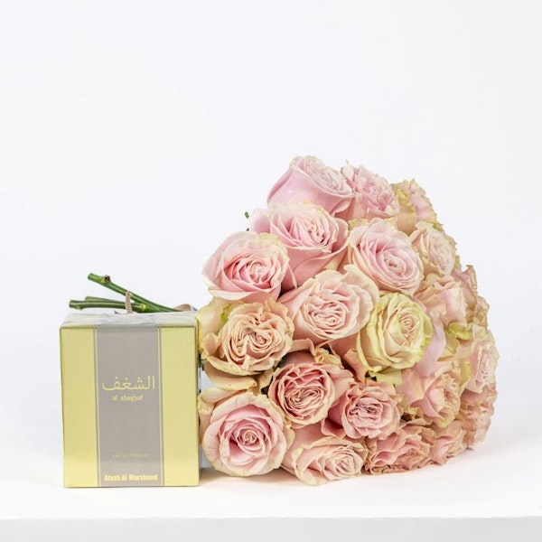 Evoke the essence of romance with the Atyab Almarshoud Al Shaghaf Gray Parfum, a captivating fragrance designed for both men and women. With its alluring blend of notes, this scent embodies sophistication and allure, making it the perfect expression of love and desire. Accompanied by a delicate bouquet of Pink Roses, symbolizing admiration and appreciation, this gift ensemble radiates elegance and sentiment. Each petal whispers sweet nothings, while the fragrance envelops the senses in a symphony of passion. Together, they create an unforgettable sensory experience, igniting sparks of romance and leaving hearts aflutter with affection.