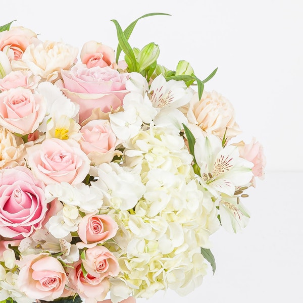 A beautiful blousy bouquet full of pink, peach and white flowers including hydrangea, roses and carnations.