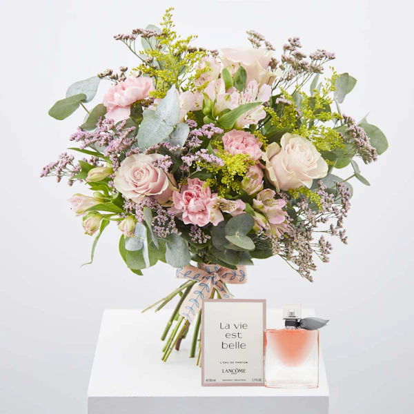 SKU FC88057Experience the epitome of elegance with Lancôme La Vie Est Belle, complemented by a delightful bouquet featuring Pink Baby Carnations, Pink Alstroemerias, and Pink Roses. Lancôme La Vie Est Belle encapsulates the essence of femininity and sophistication with its enchanting blend of floral and fruity notes. Paired with the delicate beauty of the Pink Baby Carnations, the vibrant hues of the Alstroemerias, and the timeless charm of the Pink Roses, this gift offers a sensory journey that is both luxurious and captivating. Celebrate the beauty of life and love with this exquisite fragrance and floral arrangement, a perfect expression of admiration and affection.