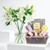 SKU FC72595This gift ticks all the boxes! Containing our best-selling classic white lilies alongside a beautiful hamper full of sweet and savoury treats show someone you care today. Whether you want to congratulate someone, send well wishes or a little gift ‘just because’, this bundle is bound to put a smile on the recipient's face.