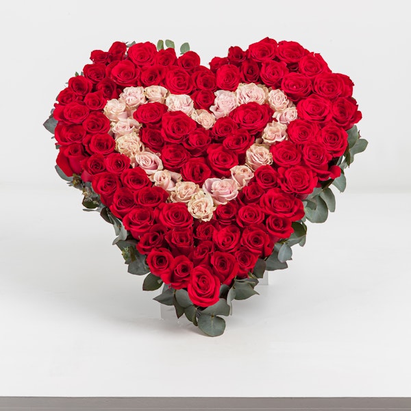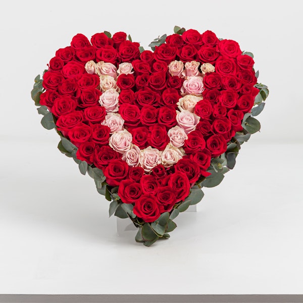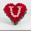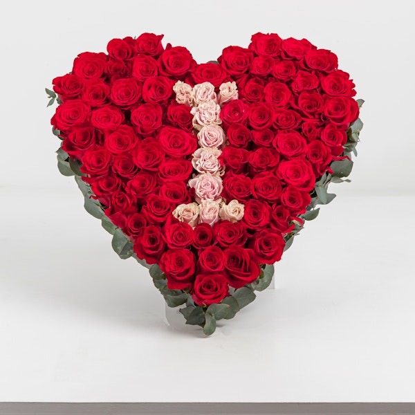 £ 12503 rose heart shapes, full of 300+ red and pink fresh roses with I <3 U lettering.