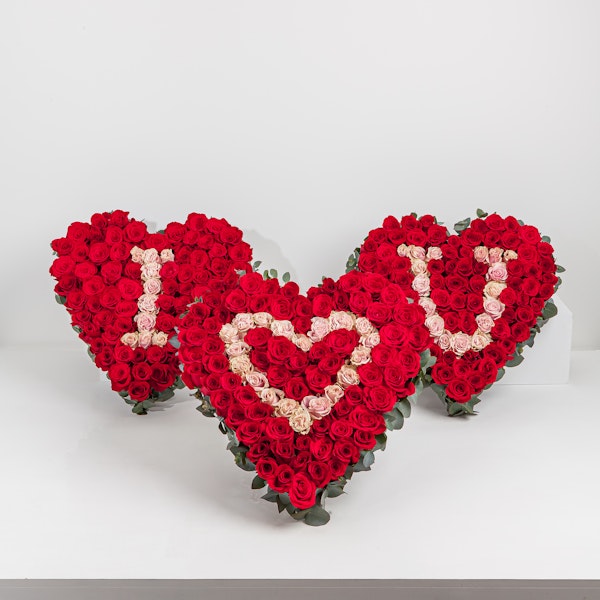 3 rose heart shapes, full of 300+ red and pink fresh roses with I <3 U lettering.