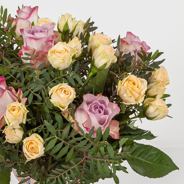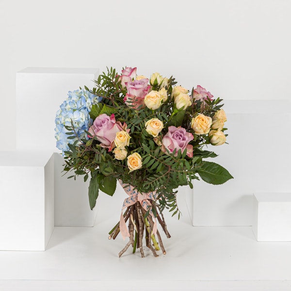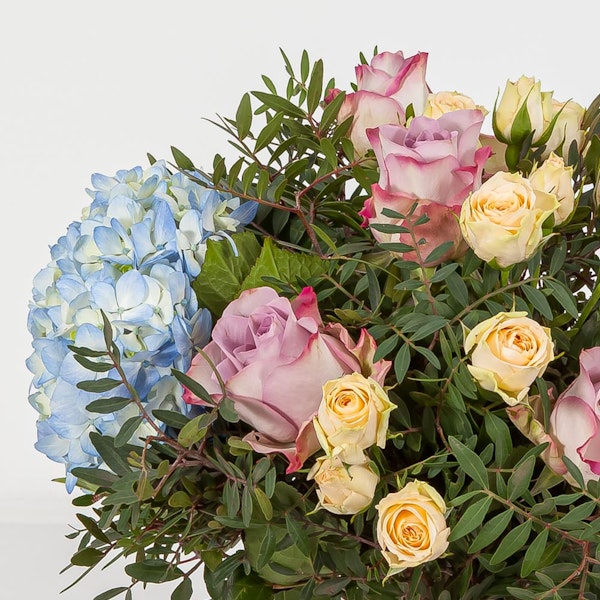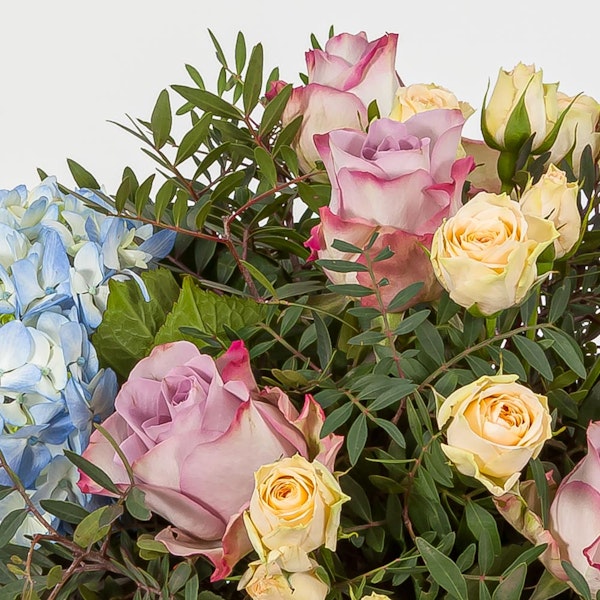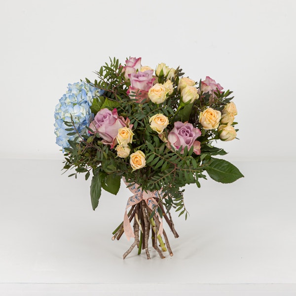 A soft pastel toned bouquet, full of roses with a touch of blue hydrangea. Gift this bouquet this season to brighten someone's day.