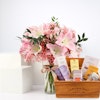 SKU FC63132Indulge your senses with the Cartwright & Butler Chocolate Hamper, a decadent delight for any chocoholic. Housed in a stunning wooden crate, this ultimate gift features Belgian Chocolate Fudge, Triple Choc Chunk Biscuits, Chocolate Wafer Crispies, Chocolate Wafer Rounds, Tiramisu Almonds, and Drinking Chocolate. Accompanying this delicious treat is a breathtaking vase arrangement overflowing with Pink Lilies and Pink Gypsophila. This stunning ensemble combines the rich flavors of gourmet chocolates with the delicate beauty of fresh blooms, creating a sensory experience that is both luxurious and indulgent. Perfect for sharing joy and sweetness on any occasion, this gift is sure to impress and delight.