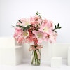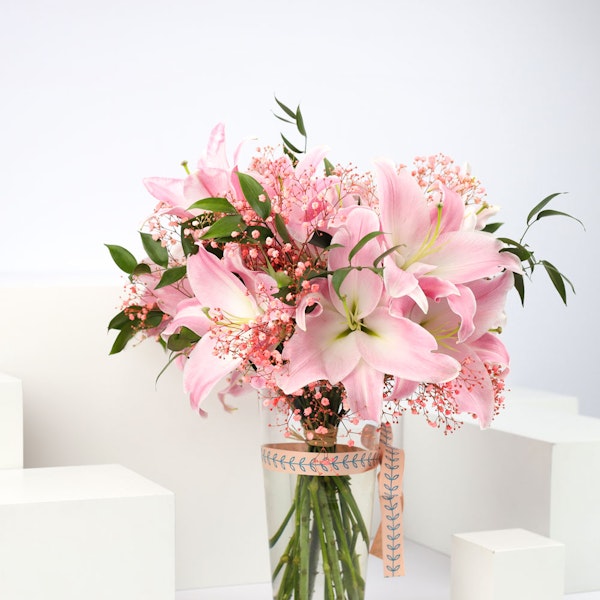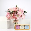 £ 130A stunning vase arrangement full of pink lilies and pink gypsophila and a chocolate trio set from Charbonnel et Walker. This gift set contains 3 boxes of 48g caramel truffles: Pink Himalayan, Dark Sea Salt and Milk Sea Salt. Each bite-sized delight is infused with exquisite flavors and adorned with special designs. Share the joy of the season with friends and family as you indulge in these delectable treats.