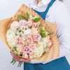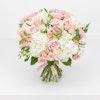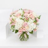 A stunning bouquet, full of flowers. This blousy white, pink and peach bouquet is handcrafted in house by one of our florists.