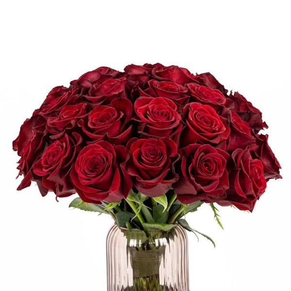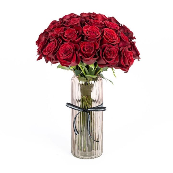 Elevate your expressions of love with a timeless gift of 25 radiant red roses elegantly displayed in a sleek glass vase. Each delicate bloom, carefully chosen to symbolize passion and devotion, is expertly arranged to create a breathtaking centerpiece that captures the essence of romance. The transparent vessel accentuates the natural beauty of the roses, allowing their vibrant color to shine through and fill the room with warmth and affection. Surprise your beloved with this enchanting gesture, a symbol of your enduring love and admiration that will leave a lasting impression and create cherished memories.