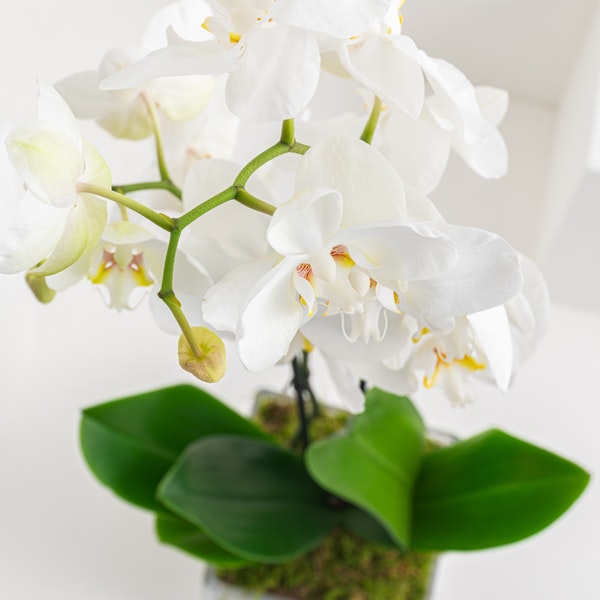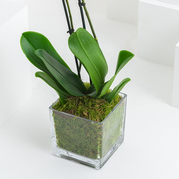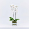 A simple classic beauty, a white Phalaenopsis orchid in a glass cube. Cube size 14cm x 14cm
